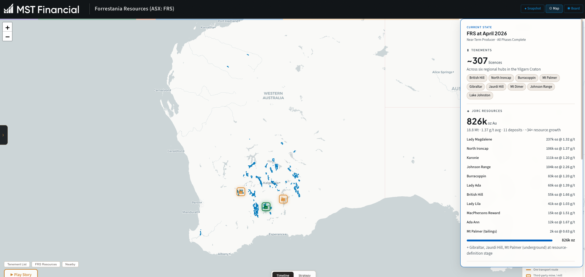 Navigate the timeline event-by-event or use the controls to view the full picture, compare nearby regional resources, and assess the portfolio's strategic positioning.