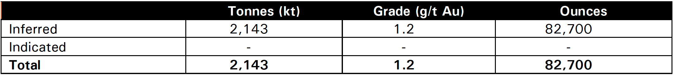 Mineral Resource – Mineralisation occurs over three separate zones. Current JORC MRE of 2.143Mt@1.2g/t Au for 82,700 ounces of gold at a cut off grade of 0.55 g/t Au.